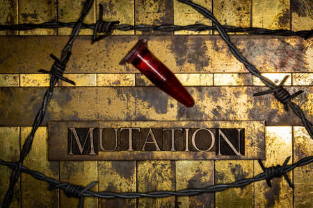 Mutation text with red fluid filled laboratory vial on vintage textured grunge copper background