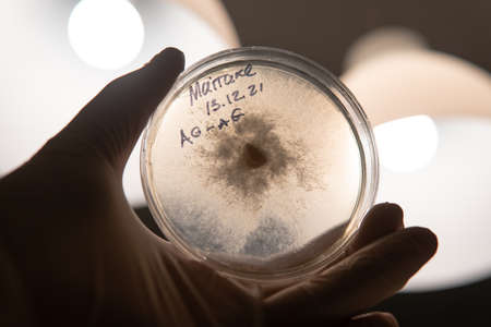 Microbiologist holding petri dish with Fungal (mycotic) cultures in laboratory, selective focus