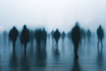 Several human-shaped figures, blurred and pale in appearance, stand close together in an undefined, foggy environment. Their faces are visible, but their bodies are obscured by a soft, ethereal glow.