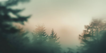 Blurry view to conifer forest inside low cloud. Dense fog among silhouettes of coniferous trees. Dark forest in haze. Ghostly atmospheric mountain landscape in foggy woodland. Hipster, vintage tones.