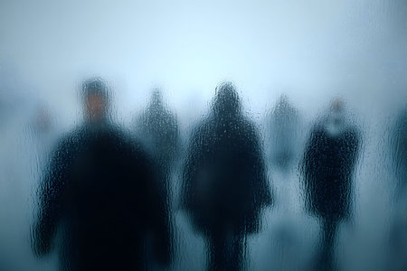 Silhouettes of people are visible through a textured glass, creating an abstract and mysterious ambience. the blurred figures and soft blue tones evoke a sense of intrigue and anonymity, perfect for creative artworks. Generative AI