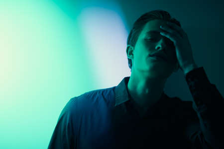 Handsome young man posing with expression at studio in dark mixed lighting. Feelings and emotions. Copy space.