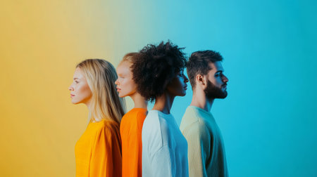 Profile view of diverse individuals against colorful backgrounds, showcasing diversity.
