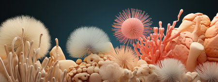 A stunning arrangement of coral and marine life featuring various shapes and colors against a soothing aqua backdrop, perfect for tropical themes and marine education.