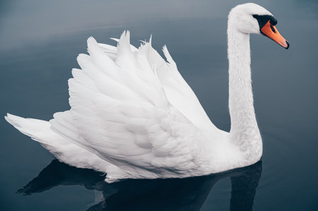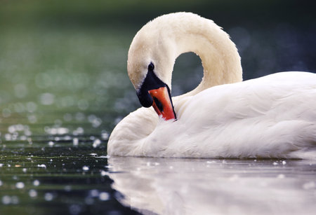 Portrait of a graceful white swan with long neck on dark green water background. The mute swan, Cygnus olor