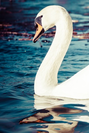 Graceful white Swan swimming in the lake, swans in the wild. Portrait of a white swan swimming on a lake. The mute swan, latin name Cygnus olor.