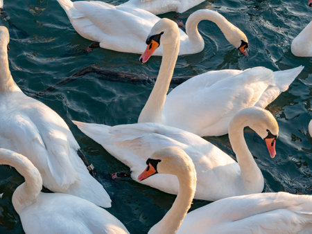A flock of beautiful white swans on the water. River nature with white swans concept