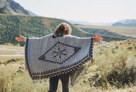 Brunette young woman traveler in poncho from back on road, trip to mountains, Altai
