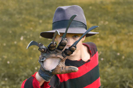 Horror faces and Happy Halloween. Make up and scary concept for man. Halloween holiday celebration - Man demon on black background.