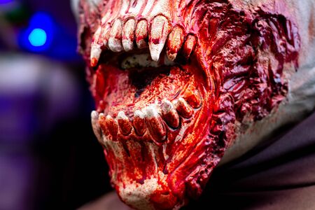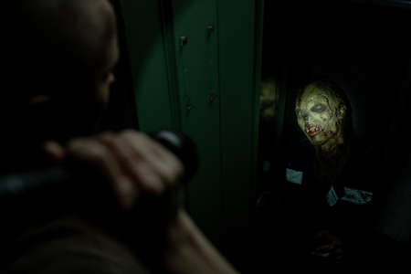 Shot of gory zombie face caught in flashlight light in dark corner, horror apocalypse and survival concept, copy space