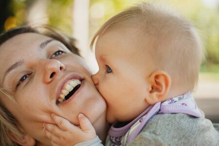 A mom holds a child in her arms. A mother kisses a toddler. A young women hugs her infant. A girl has fun and rejoices with the baby.Close up.
