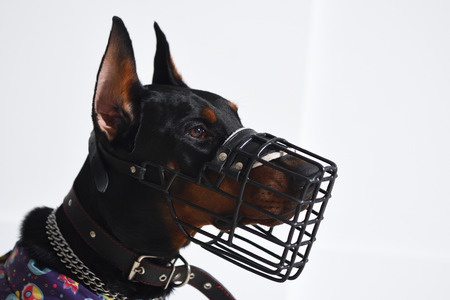 Young Doberman in a muzzle, head close up against a white wall