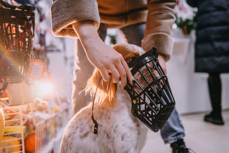 Choosing a muzzle for a dog in a pet store. Dog in a pet store. Buying a muzzle. Dog in a muzzle.