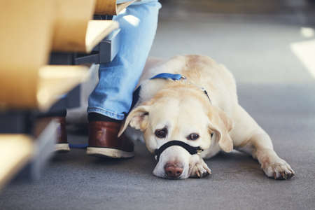 Young man travel with his dog by public transportation. Labrador retriever lying on the floor of the tram.