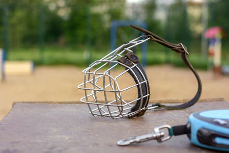 An iron metal muzzle for a large dog with a leather belt on the background of a dog walking and training area. Safety and education of the dog. Accessories for dogs