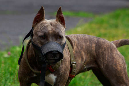 American staffordshire terrier dog wearing black leather muzzle. close-up.