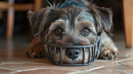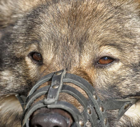Dog and the muzzle, used to prevent bites from aggressive dogs. He can't bite anymore.