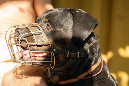 Portrait of an adult Rottweiler dog in a metal muzzle on a sunny day