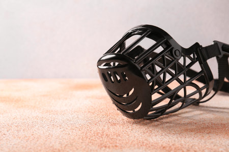 Black plastic dog muzzle on beige table, closeup. Space for text