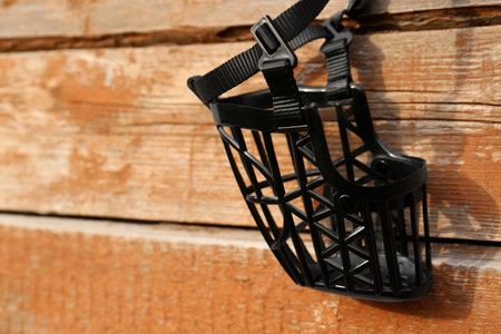 Black plastic dog muzzle and leash on wooden table