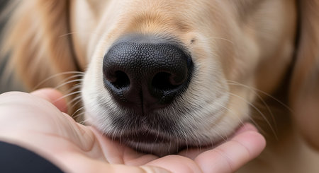 An intimate close-up shot of a golden retriever's wet nose and muzzle as it gently sniffs a person's outstretched hand. The image captures a moment of trust, connection, and friendship between a human and a dog. It highlights the dog's powerful sense of smell and gentle nature.