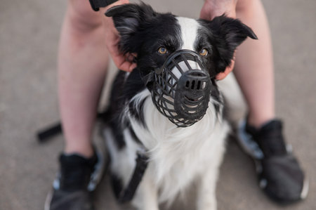 Close-up of a dog in a breathable mesh muzzle, showing trust and comfort with its handler.
