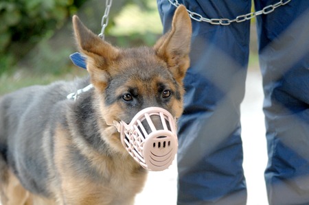 Young German Shepherd with plastic muzzle
