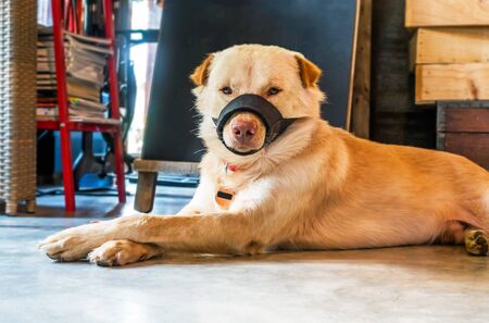 Dog wear muzzle. Selective Focus at the dog eye