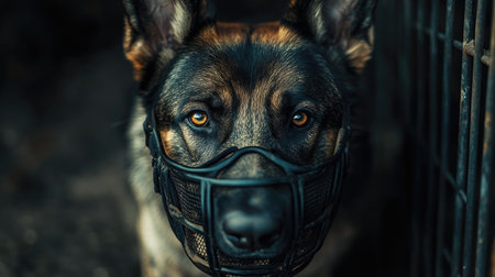 A portrait of a Belgian Malinois Shepherd with a leather mussel guarding for safety