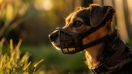 A dog in a muzzle enjoys a green outdoor setting, highlighting its obedient and friendly nature