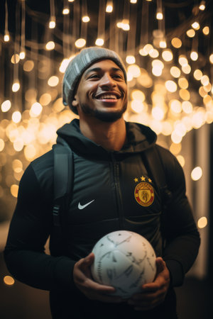 Portrait of a happy young man holding a soccer ball in his hands and smiling