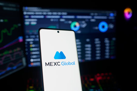 Dhaka, Bangladesh 26 September 2025:Smartphone with MEXC Global logo in front of trading charts on screens