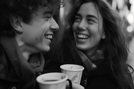 Young couple embracing in warm winter clothing, smiling and flirting generated by artificial intelligence