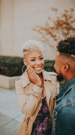 Loving Smiles of African American Couple in Urban Setting, Embracing Connection and Joy.