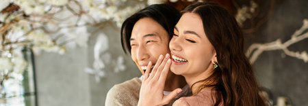 A black man and an Asian woman share a joyful moment smiling widely. The setting highlights their happiness with an emphasis on diversity and family unity.