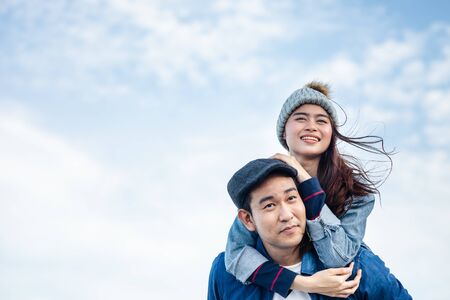 Piggy back Asian couple with blue sky and cloud, love concept.