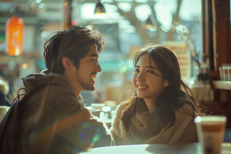A young Asian couple sitting together, the man gently touching his fiancae's hand, both smiling and sharing a quiet, happy moment