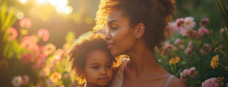 Mother and child enjoy quality time surrounded by vibrant flowers in a lush garden setting during the warm afternoon light