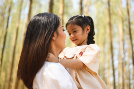 Mother holding cute daughter and laughing together in pine forest park