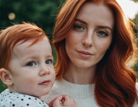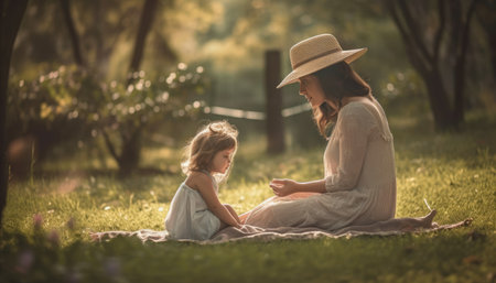 Mother and child spending quality time together in a natural setting, such as a park or garden. Mother's Day.