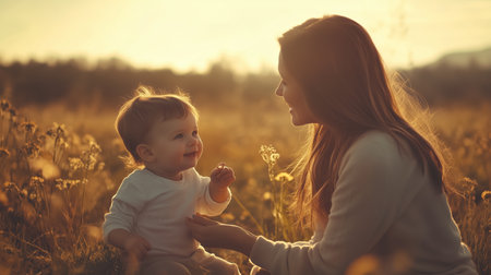 A mother and her baby enjoy a sunny afternoon in a golden field filled with wildflowers, creating precious moments together during the golden hour of the day