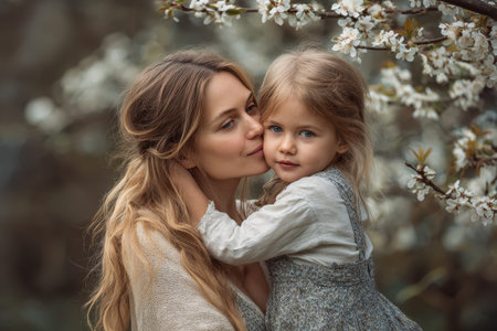 Mom embraces daughter with love surrounded by blooming flowers in a vibrant spring garden during a sunny day