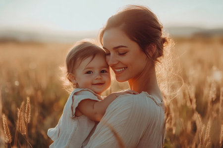 Mother and baby sharing a tender moment in a golden wheat field, bathed in the warm glow of the setting sun