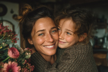 Portrait of a happy mother and daughter embracing at home with flowers in the background