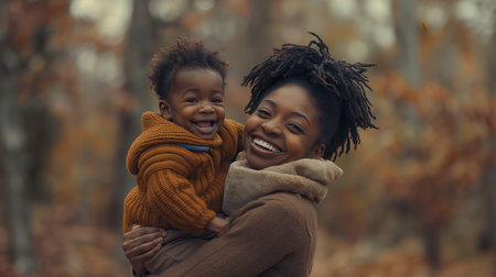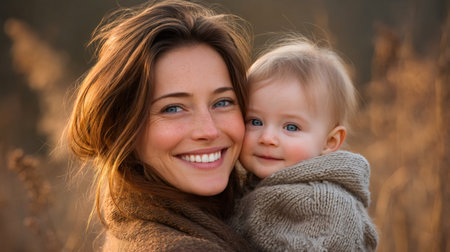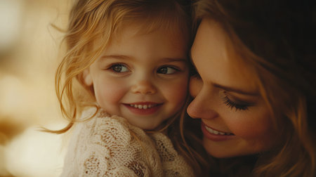 A mother holds her young child close, both smiling happily. The warm atmosphere and soft lighting create a cozy and loving moment between them.