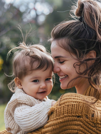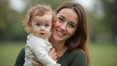 A smiling woman with long brown hair cradles her curious baby in a serene park setting, radiating warmth and love. The child’s wide eyes and the mother’s beaming smile create a heartwarming scene that captures the essence of family joy and connection.