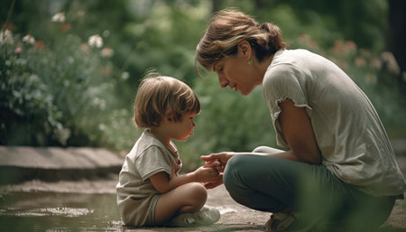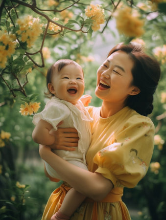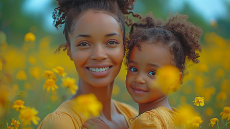 Amidst a field of golden blooms, a mother's love blossoms A gentle touch, a compassionate hand, offers her child solace and support Nurturing their emotional well-being, she creates a moment of pure joy, reminding them of the strength and happiness found in her embrace AI Generative