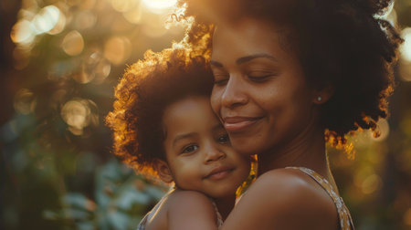 A mother holds her child closely, both with peaceful expressions, surrounded by a soft, warm light. The intimate moment captures their bond beautifully during the evening hours.