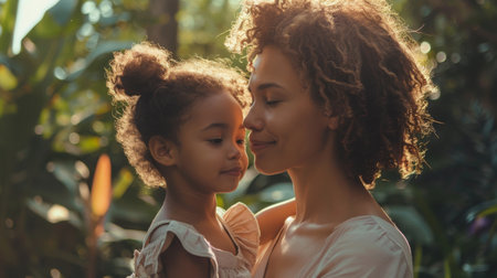 Afro-American Mother and little daughter on nature sunny background, Mother's Day, love family, parenthood, childhood concept. Generative ai.