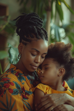 Young black mother holding her daughter embracing, their foreheads touching, sharing a tender moment in a cozy home. Maternal love concept